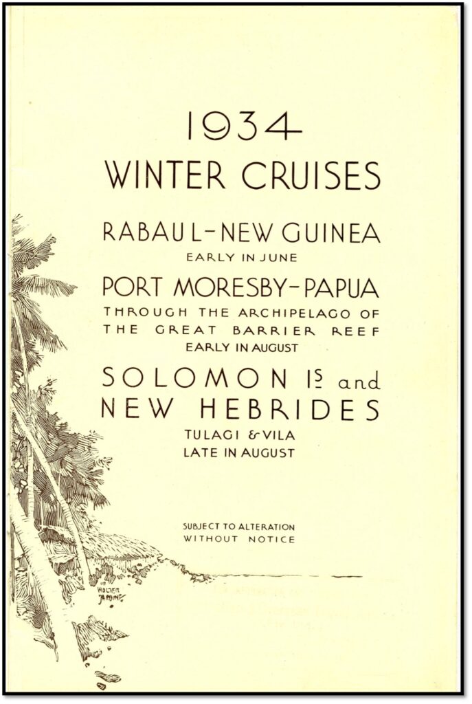 This brochure cover for Italian Line’s very first world cruise always caught my eye. You just wanted to be aboard! Well, only less than 100 passengers booked for the trip and sensibly it was canceled. It was after all the peak of the Depression and money as well as world cruise passengers were in short supply.